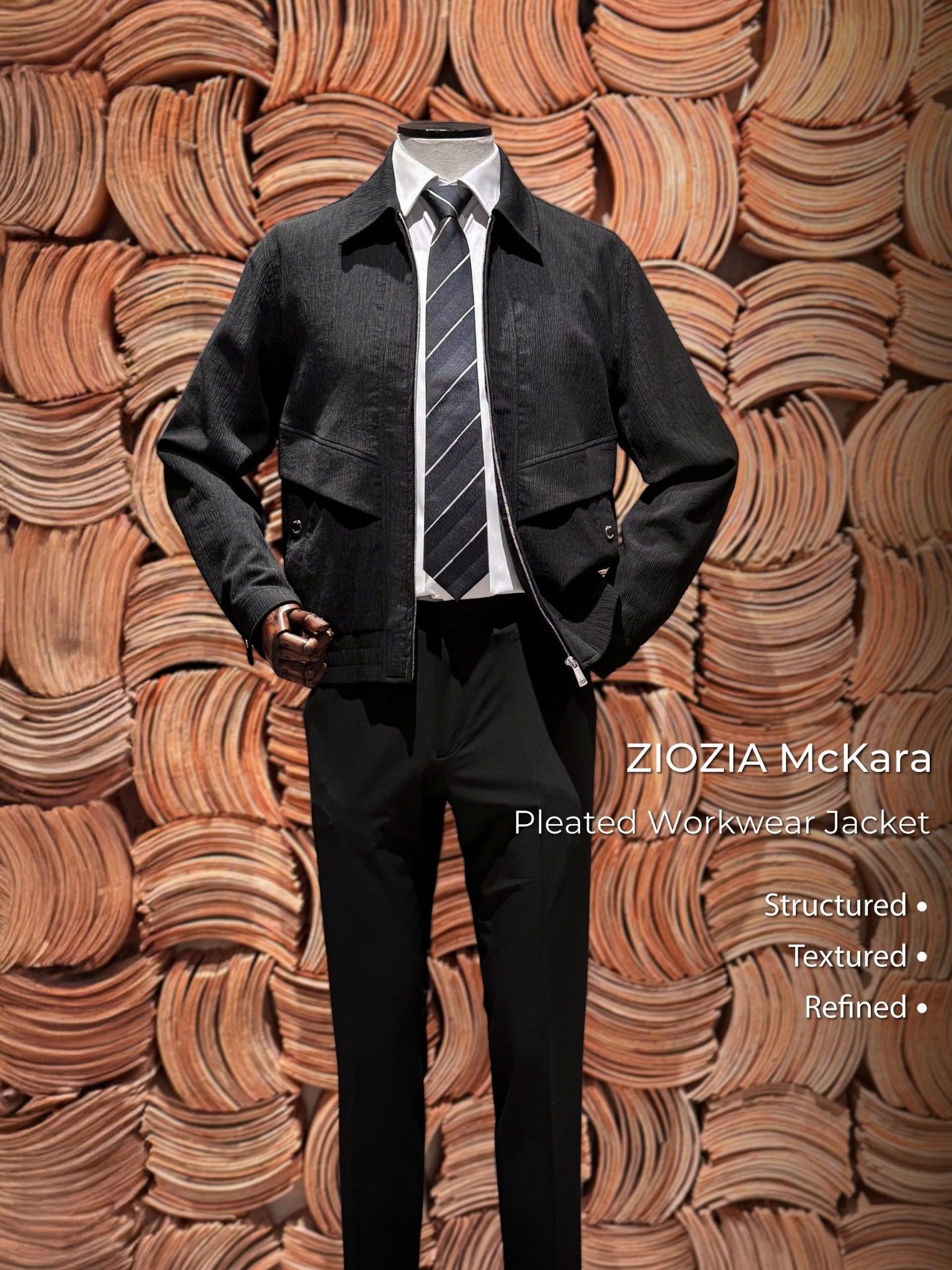 - CHẤT LIỆU: Chiếc áo khoác mang tinh thần modern workwear với thiết kế cổ bẻ tối giản, khóa kéo kim loại và phom utility đứng vừa vặn.