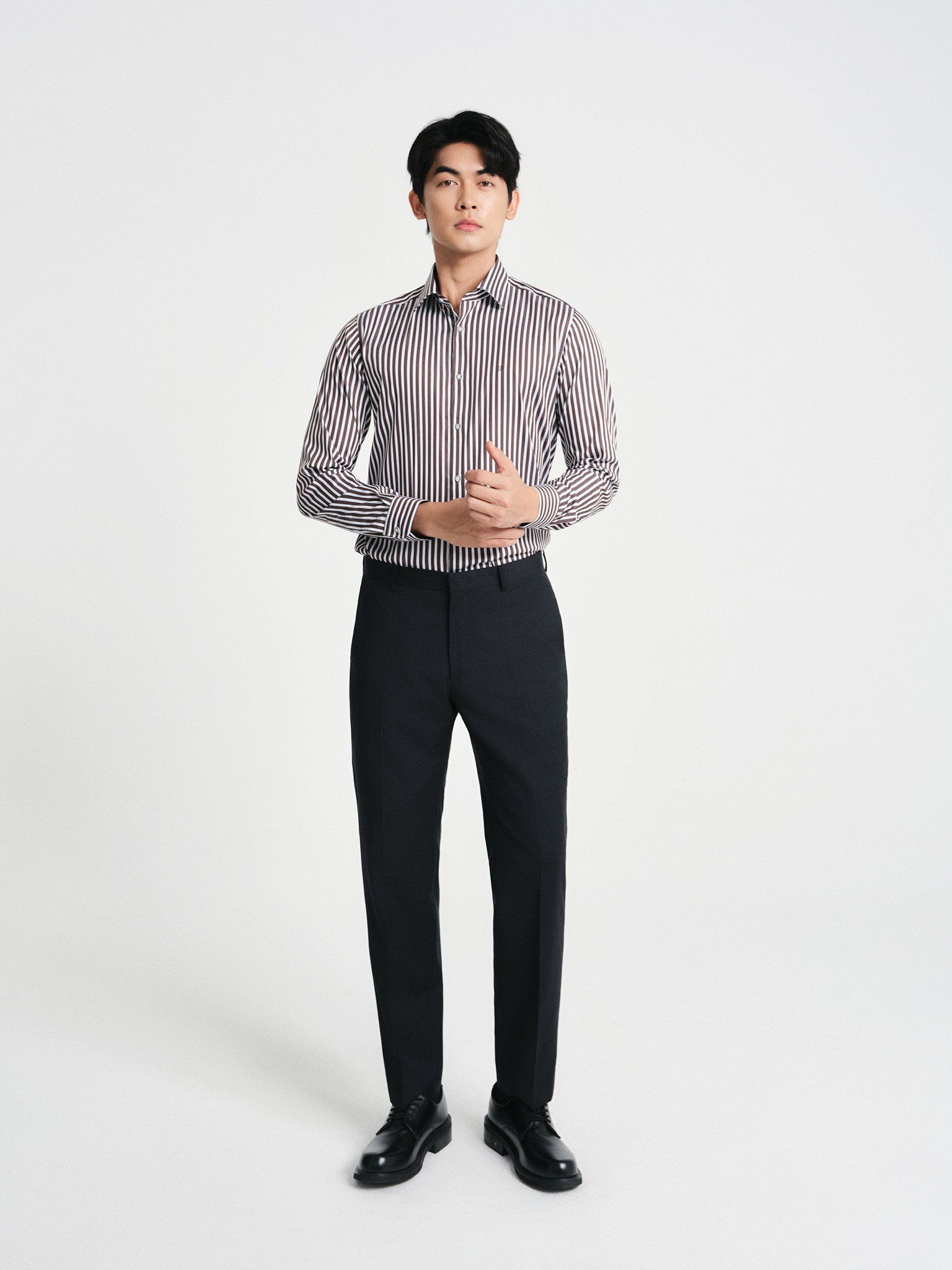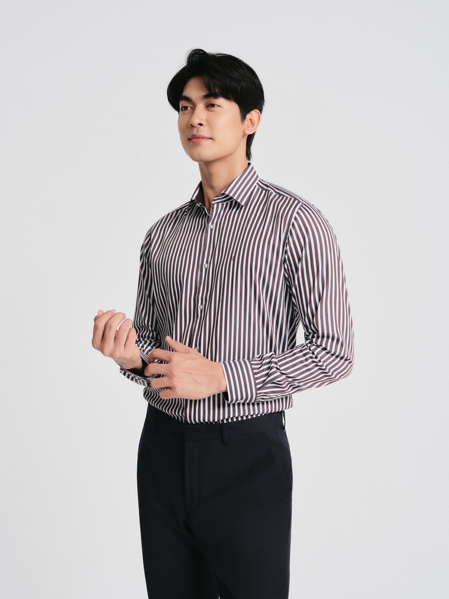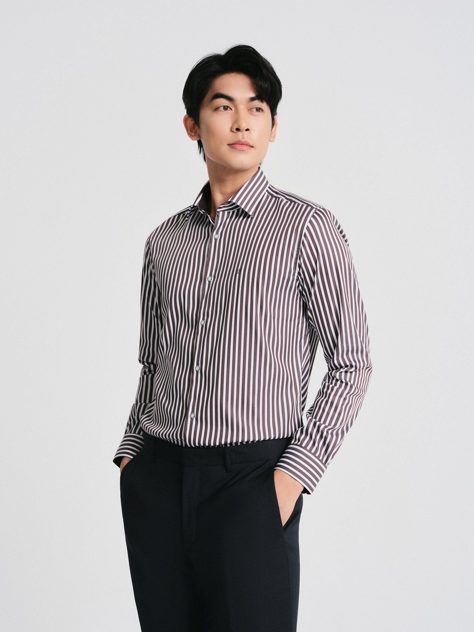 Phom slim vừa vặn, kẻ sọc dọc tạo hiệu ứng tôn dáng, giúp thân trên thanh thoát và lịch thiệp hơn. Gam nâu phối sọc trắng sang trọng, dễ phối từ blazer, suit đến quần âu – nâng tầm vẻ ngoài chỉn chu mà không cần nỗ lực.