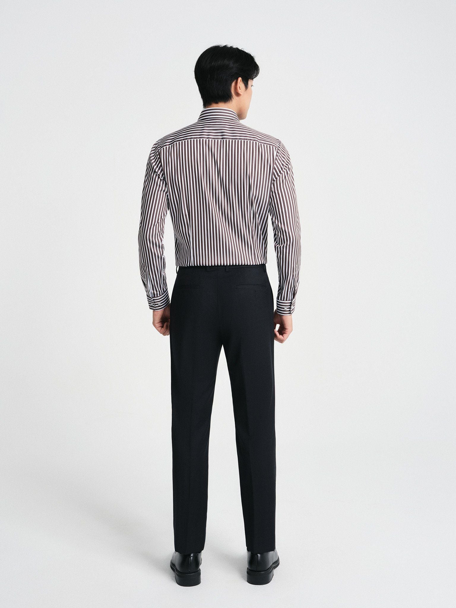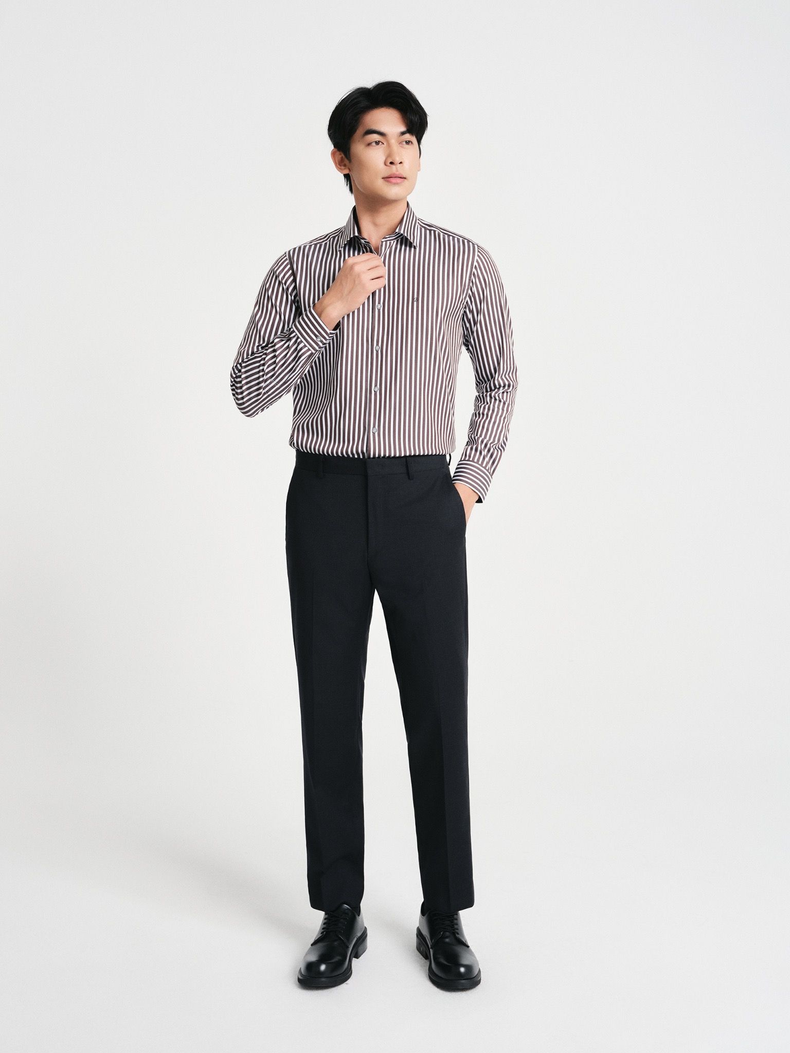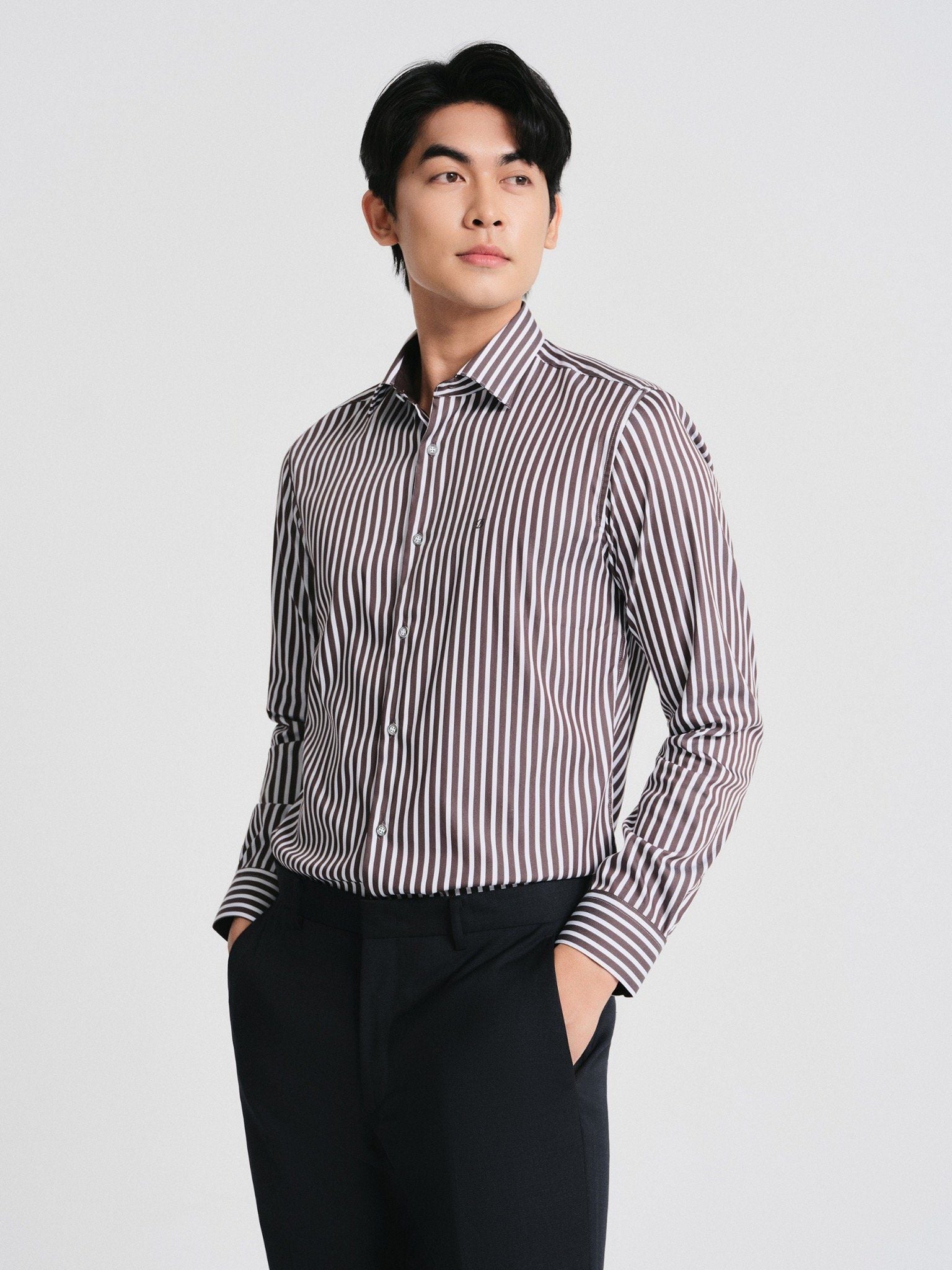 Phom slim vừa vặn, kẻ sọc dọc tạo hiệu ứng tôn dáng, giúp thân trên thanh thoát và lịch thiệp hơn. Gam nâu phối sọc trắng sang trọng, dễ phối từ blazer, suit đến quần âu – nâng tầm vẻ ngoài chỉn chu mà không cần nỗ lực.